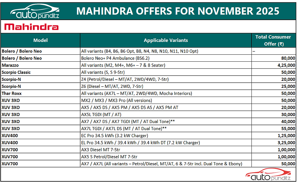 Discounts and Offers on Mahindra Cars for November 2025