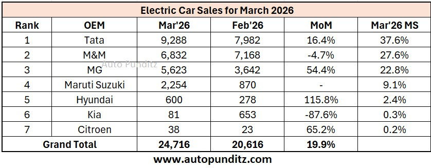 India’s electric passenger vehicle (PV) segment closed FY2026 on a strong note, with March emerging as a record-breaking month for EV dispatches. Driven by aggressive year-end push, discounts, and rising fuel cost concerns, EV adoption accelerated sharply across OEMs and models. Passenger Car dispatches stood at 24,716 units in March 2026, marking a strong 19.9% MoM growth, highlighting robust wholesales by manufacturers.